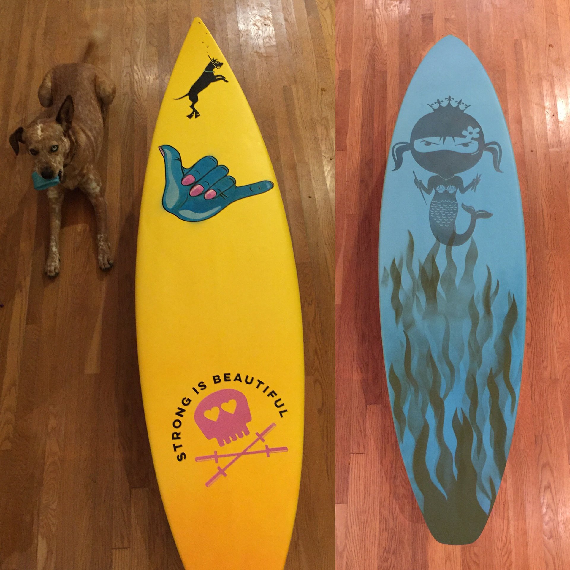 Created this surfboard for Adobe Max 2016. This board was displayed at the Adobe Bash and in the Skateboard build session. I used Montana paint and created with inspiration from my dog Cooper and my passion for CrossFit. Mermaid from my Badass Skatemom stickers and clothing.